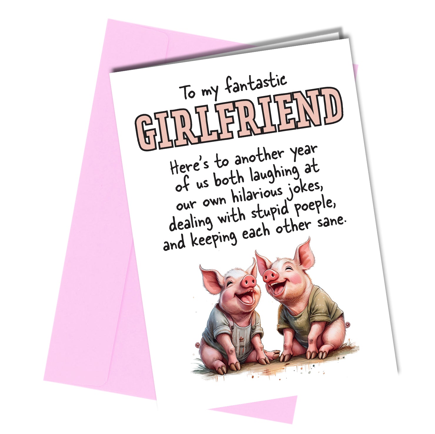 " To my fantastic Girlfriend. Here's to another year of us both laughing at our own hilarious jokes, dealing with stupid people, and keeping each other sane." All our cards are printed on white quality 350gm card. Every card will be sent with a quality 120gm blank envelope Size A4...