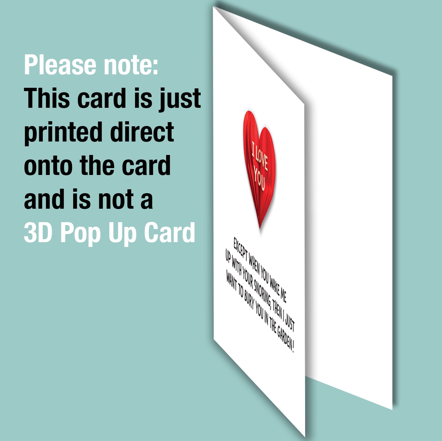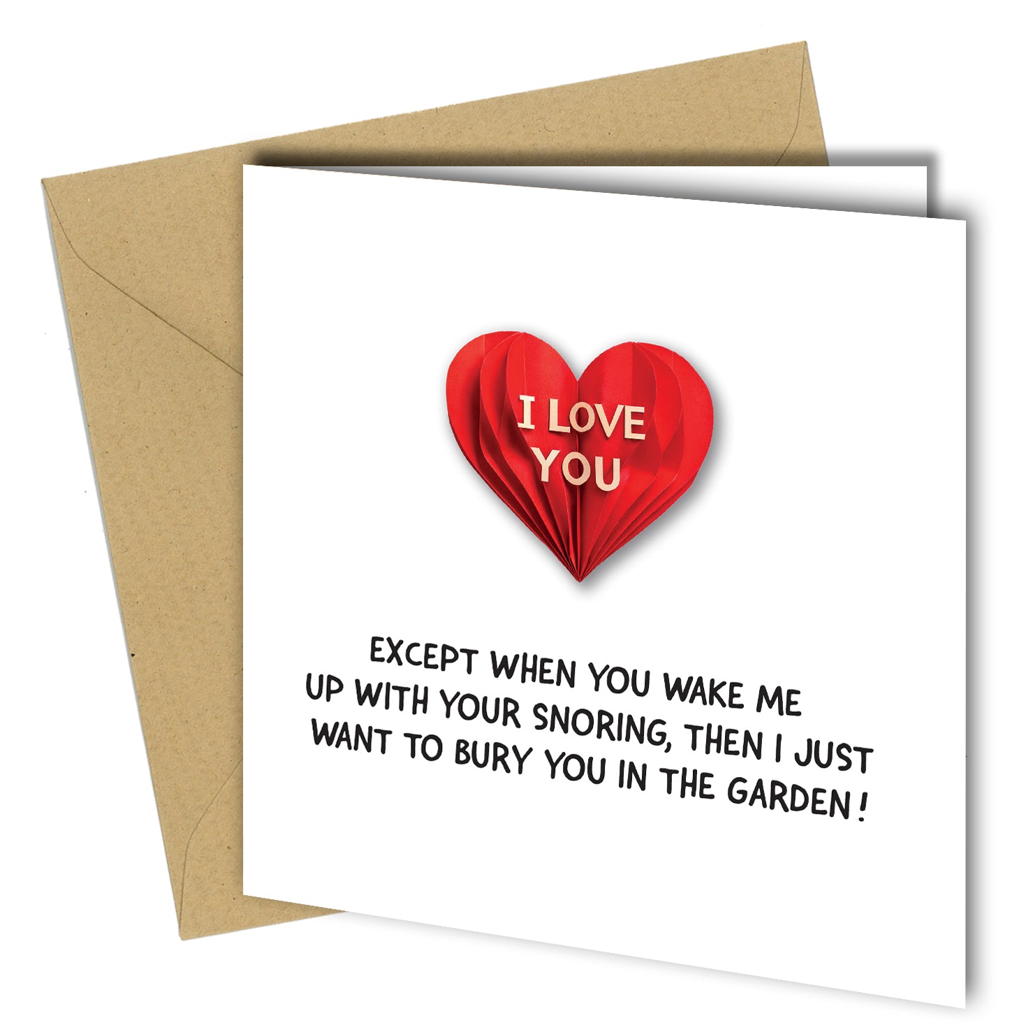 "I Love You, except when you wake me up with your snoring, then I just want to bury you in the garden!" All our cards are printed on white quality 350gm card. Every card will be sent with a quality 120gm blank envelope Size Folded Size = 150 x 150...